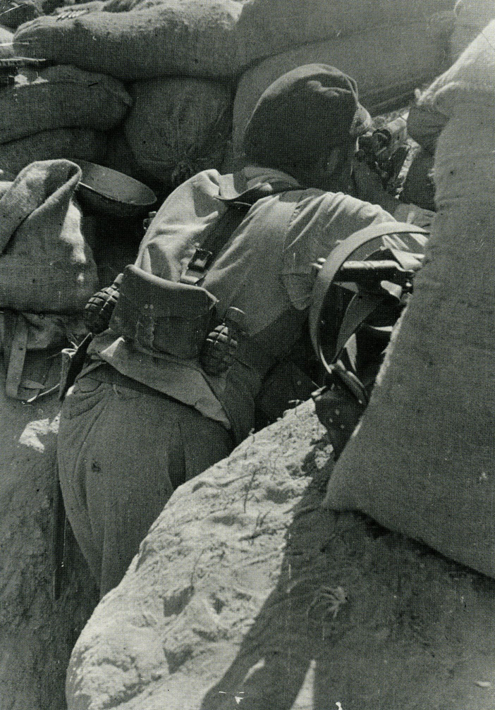 … buscaba a los milicianos anarquistas llegados de Alcoy y pertenecientes a la Juventudes Libertarias. Disfrutaron ambos haciendo docenas de fotografías de los soldados en plena siesta bajo la sombra protectora de unos árboles. Rostros relajados, posturas distendidas. Uno dormía acompañado de su perro; otros, abrazados a sus fusiles boca arriba, boca abajo o de costado. Uno de ellos hurgándose en la bragueta. Era la placidez de los que tienen la conciencia limpia y las manos encallecidas de trabajar en el campo o en las minas extrayendo calcopirita.